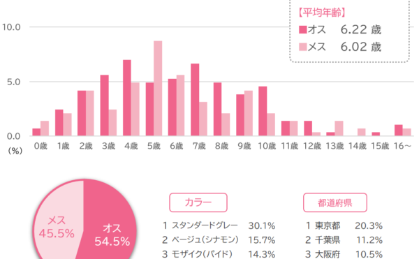 NEW 2025年12月10日チラケアJCA チラケア通信 2025年12月号JCA会員1人あたり(1世帯)のチンチラさん平均登録数は2.12匹、全体の平均年齢は6.12歳(オス平均 6.22歳、メス平均 6.02歳)。 都道府県別のチンチラさん登録数は東京都(20.3%)、千葉県(11.2%)、大阪府(10.5%)、次いで神奈川県・兵庫県(8.4%)。