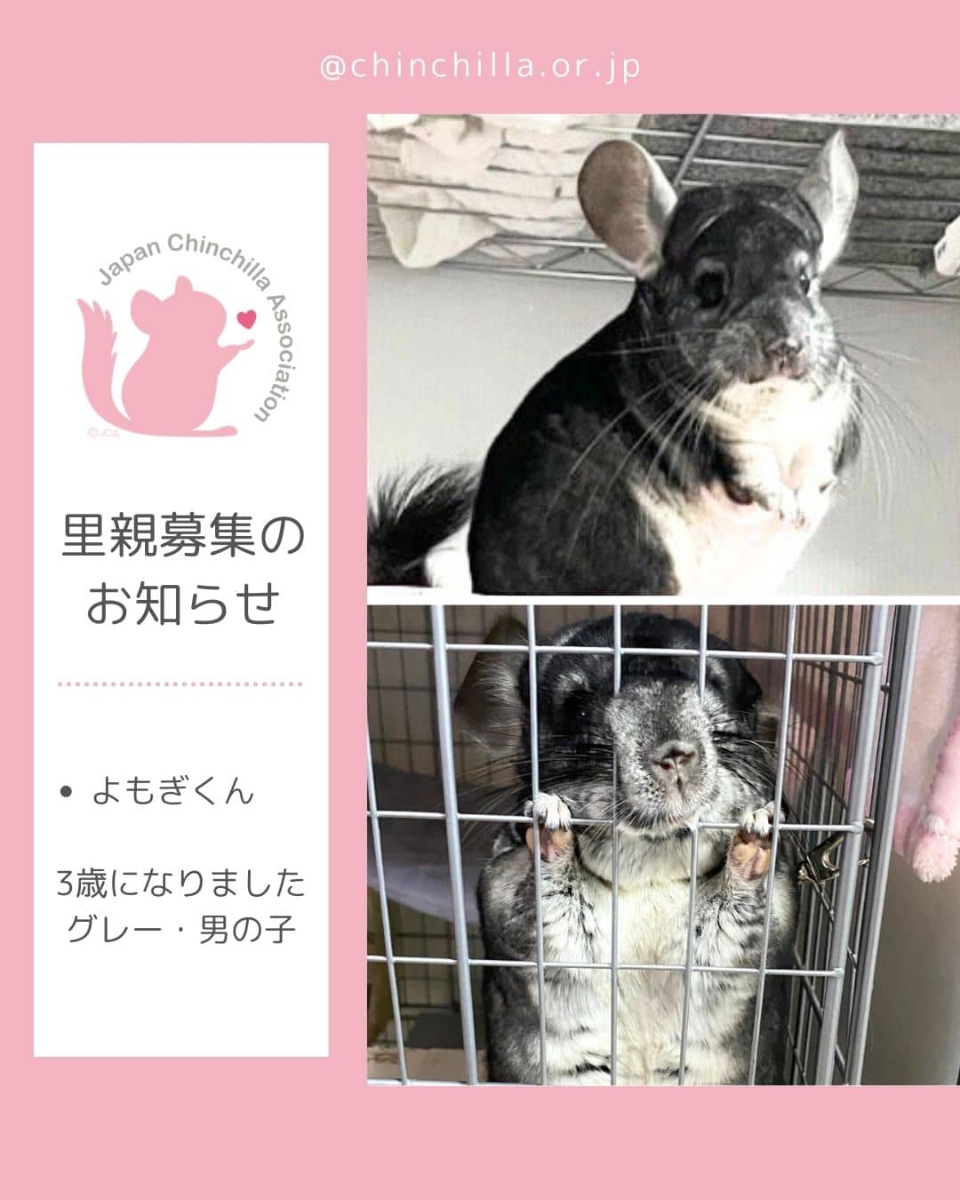- ご応募いただく方がJCA会員様であること、また対象のチンチラさんはご自身のChilla-Care(チラケア)へご登録済みのチンチラさん(1匹限定)であること。