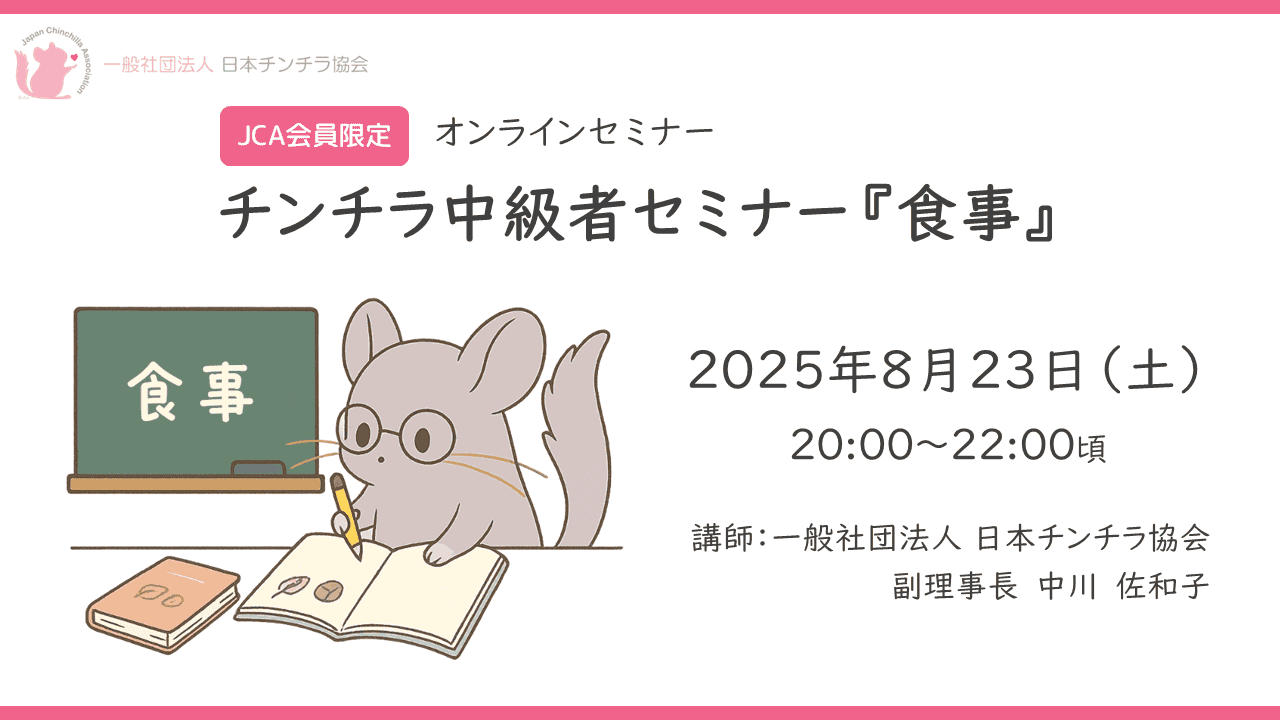 2025年8月23(土)【JCA会員限定】オンラインチンチラ中級者セミナー:第1回『食事』を開催いたしました。セミナー受講後にお答えいただいたアンケートのご質問およびご意見・ご感想と、講師からのひとことを掲載させていただきます。