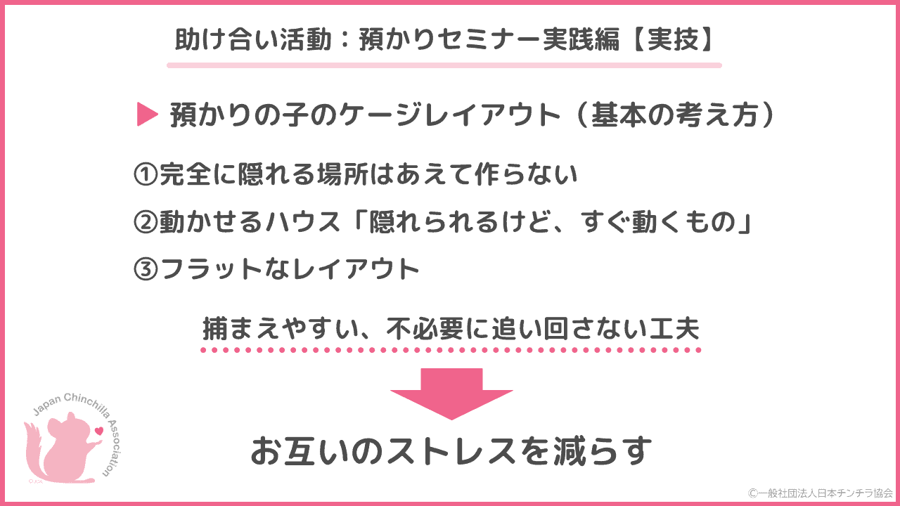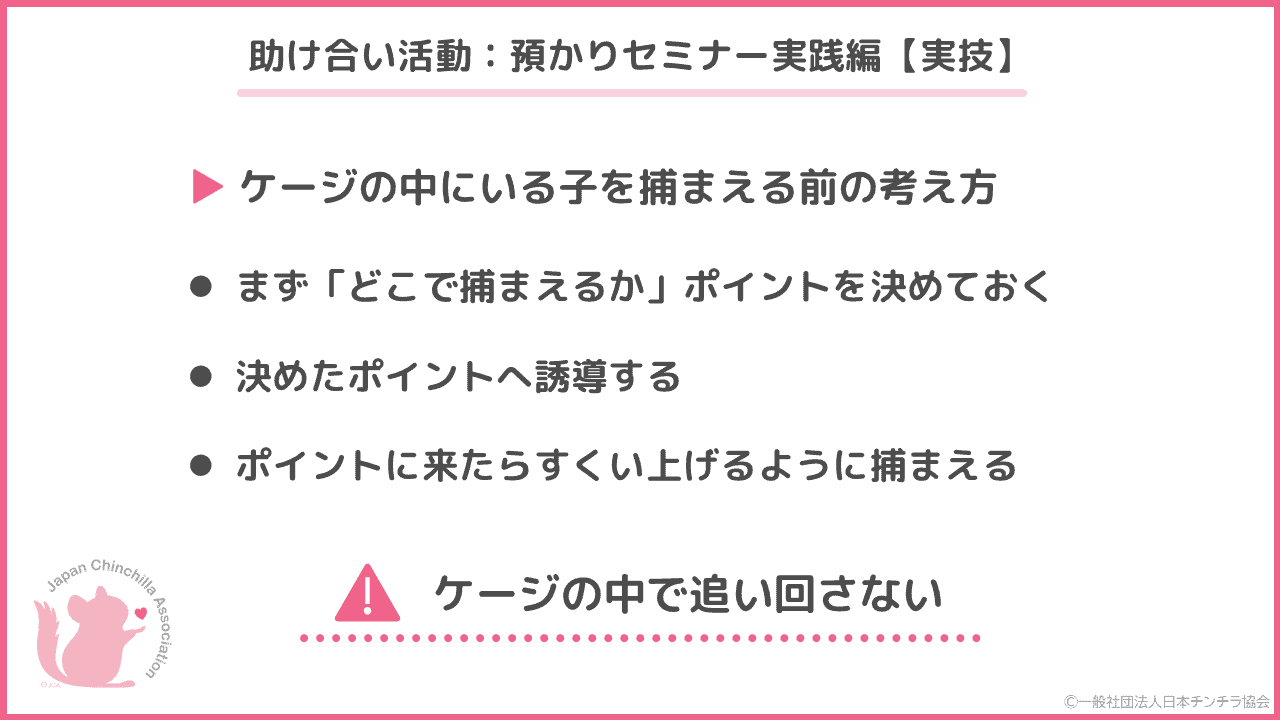 今回の預かりセミナー実践編は、10月25日のオンライン勉強会で学んだ知識をもとに、実際のチンチラさんと向き合う中で理解を深めることを目的に開催されました。テーマは、初対面のチンチラとの接し方と、預かりを行う際に欠かせない先住チンチラとの関係づくりです。