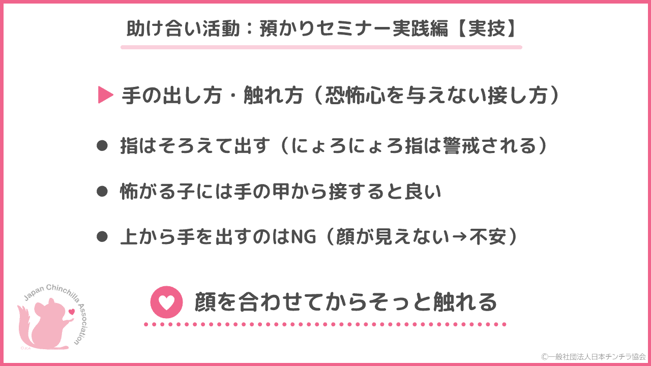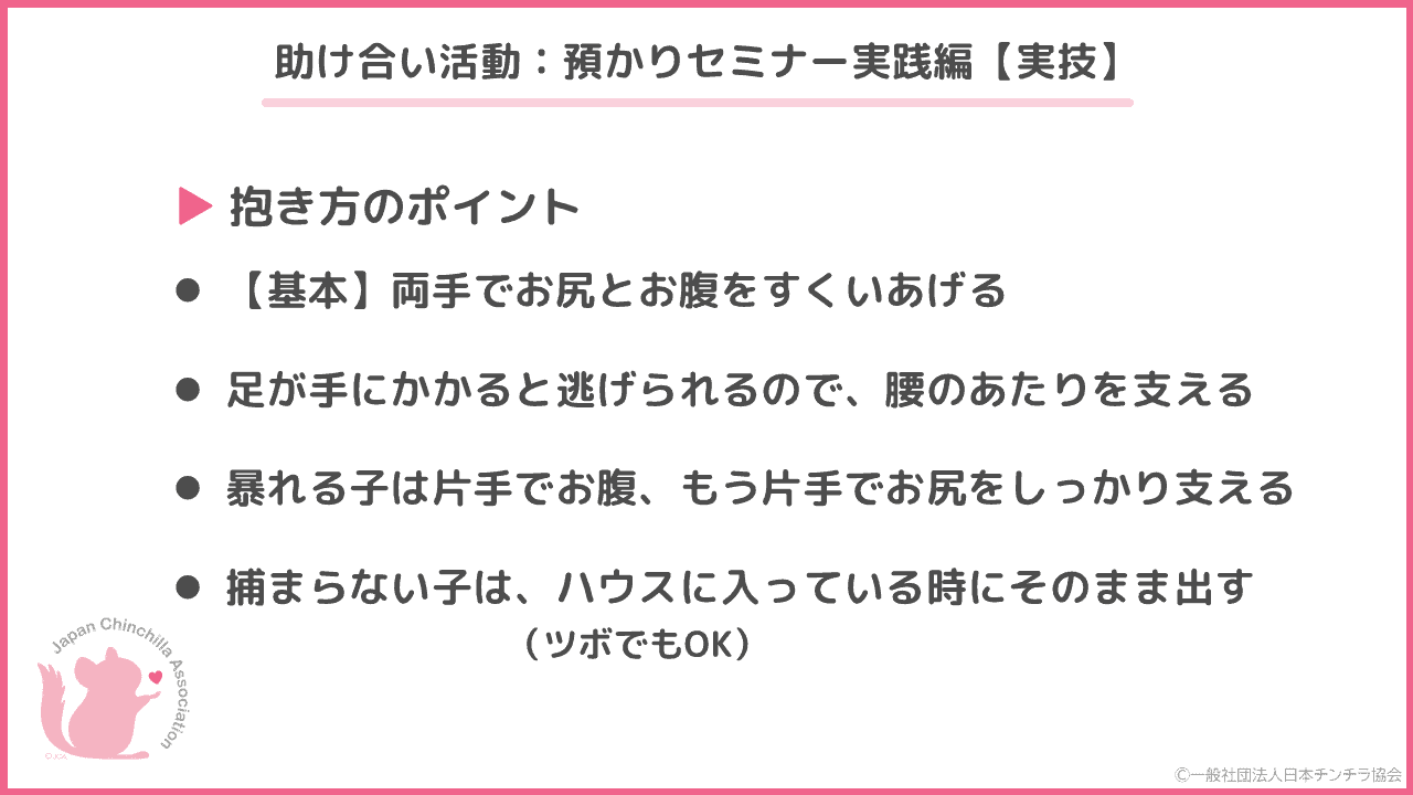 実技編では、預かり活動を行う際に必要な「安全な環境づくり」から「チンチラの扱い方」まで、実際の動きを交えながら学びました。