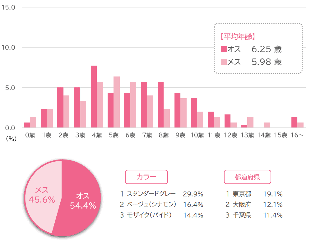 2026年2月28日時点で、全体の平均年齢は6.11歳(オス平均 6.25歳、メス平均 5.98歳)です。