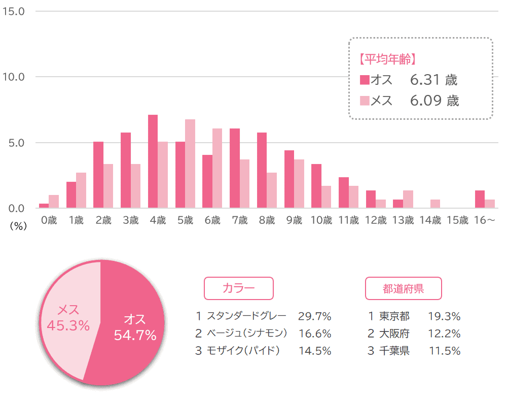2026年3月31日時点で、全体の平均年齢は6.20歳(オス平均 6.31歳、メス平均 6.09歳)です。