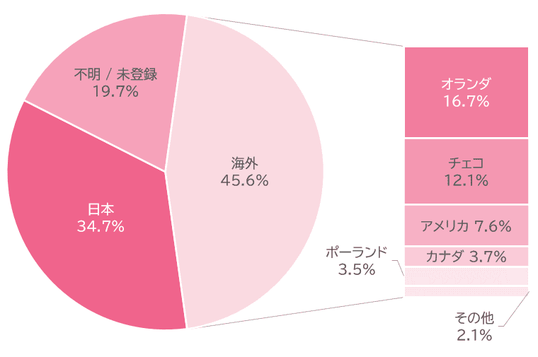 海外出身チンチラさんの出生地として多いのは、「オランダ」「チェコ」「アメリカ」。そのほかにも「カナダ」や「ポーランド」など、多彩なルーツを持つチンチラさんが登録されています。